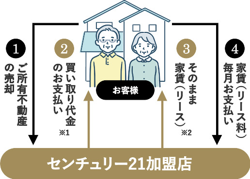 リースバックは、お客様のご自宅等の不動産資産を弊社提供企業に売却して一括資金を得ると同時に、賃貸借契約に切り替えてお住いを頂くサービスです。従いまして、お客様の不動産資産の所有件は弊社提携企業に移転する形となります為、お住まいの所有権を手放したくない場合は、ご利用にご注意をお願いいたします。 - 月々のお家賃、ご契約の際の費用が必要となります。